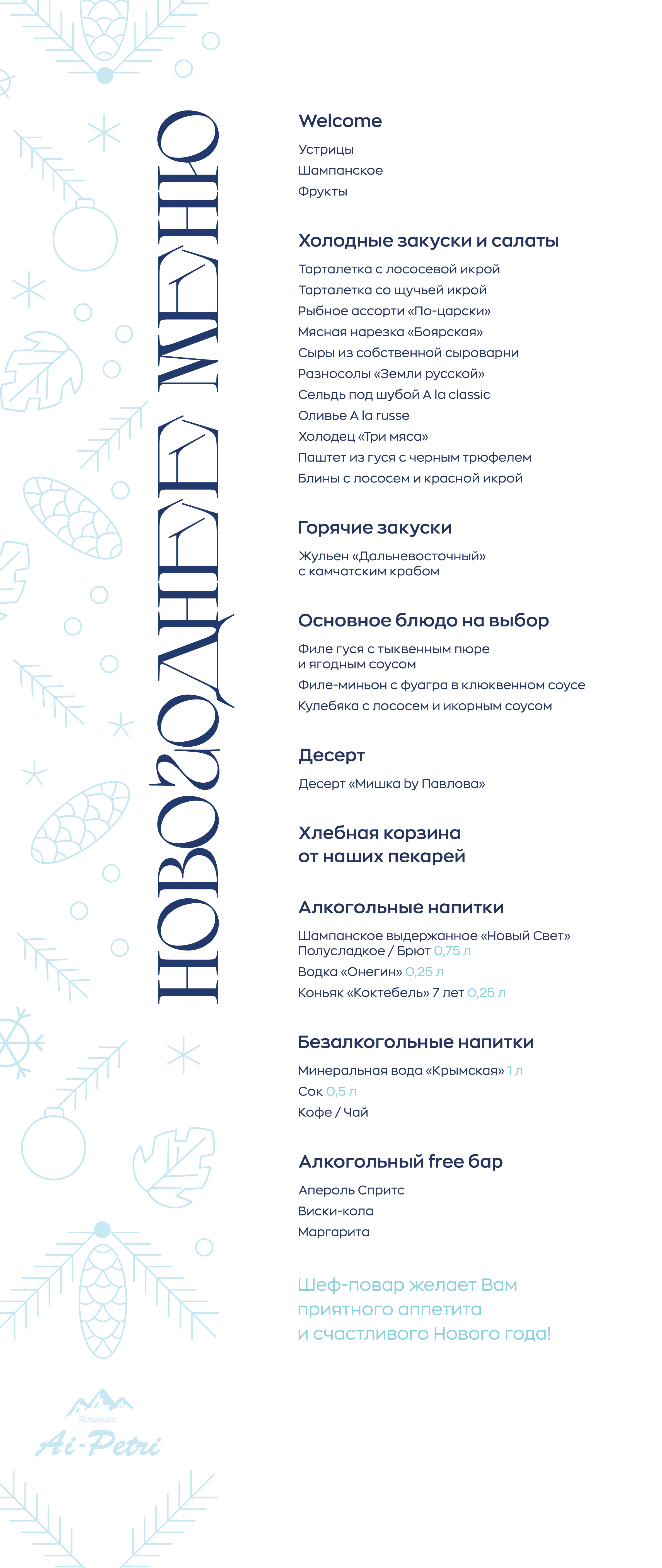 Дресс-код: A La Russe – образ с элементами традиционных русских мотивов. Для юных гостей в зале «Олимп» будет организован игровой клуб с новогодней анимацией. Время банкета с 22:00 до 02:00